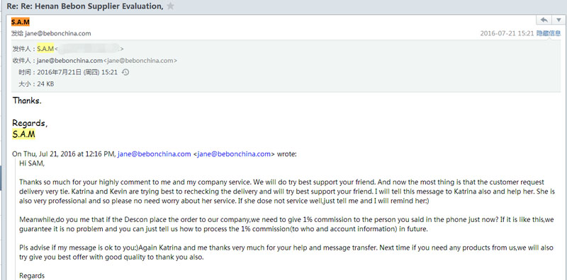 2. Our email to customer to appreciate his support. Based on our his recommendation, we not only start business with his friends by providing good quality also, but also share commission to our customer to express our thanks and sincerity.