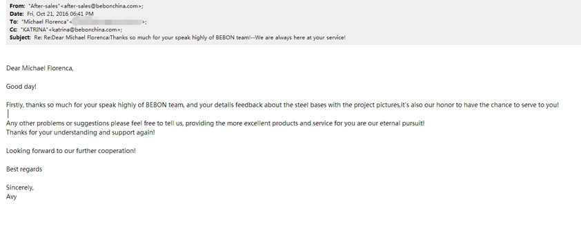 2. Customer’s reply to speak highly about BEBON’s quality control and logistic service